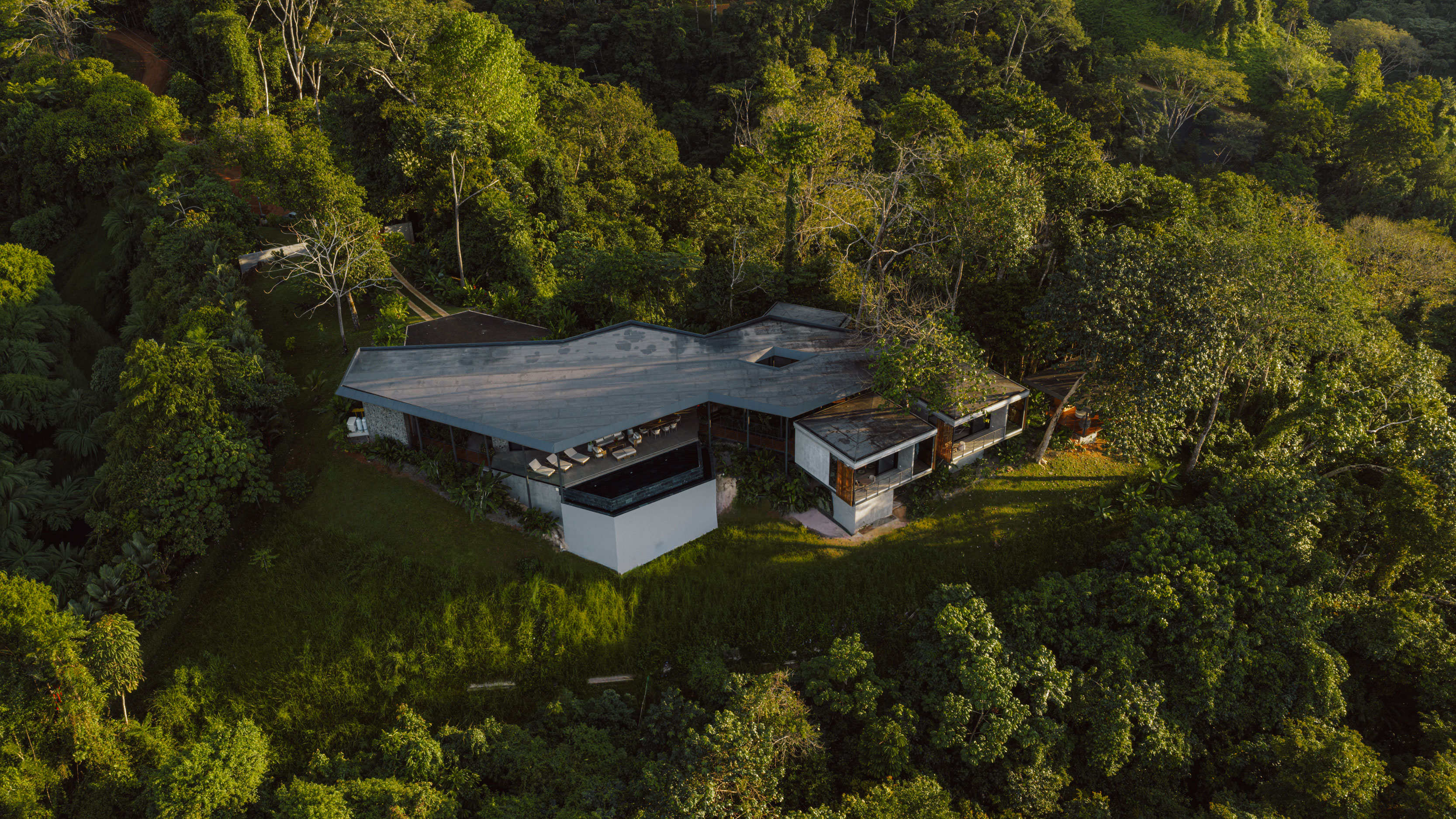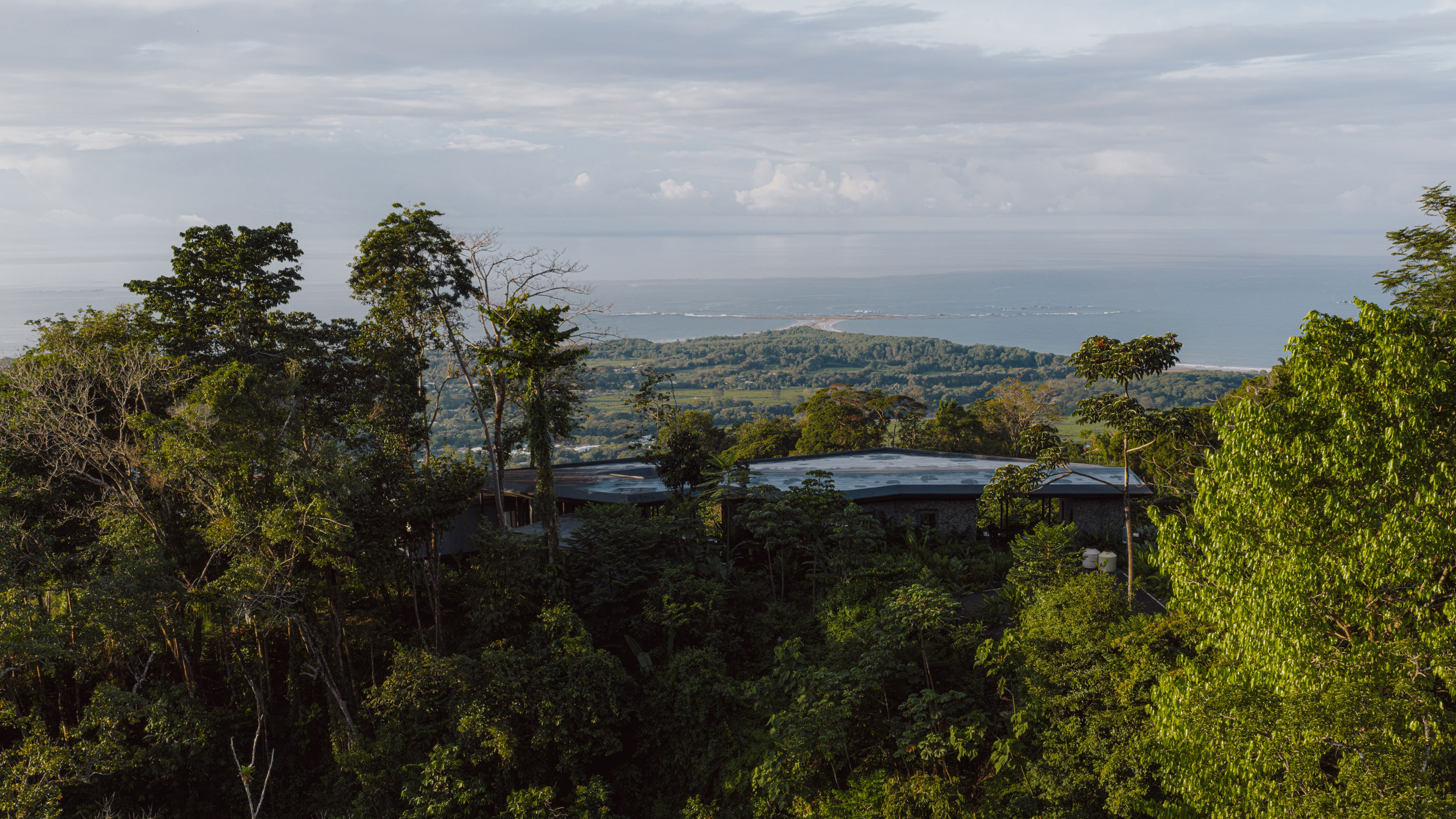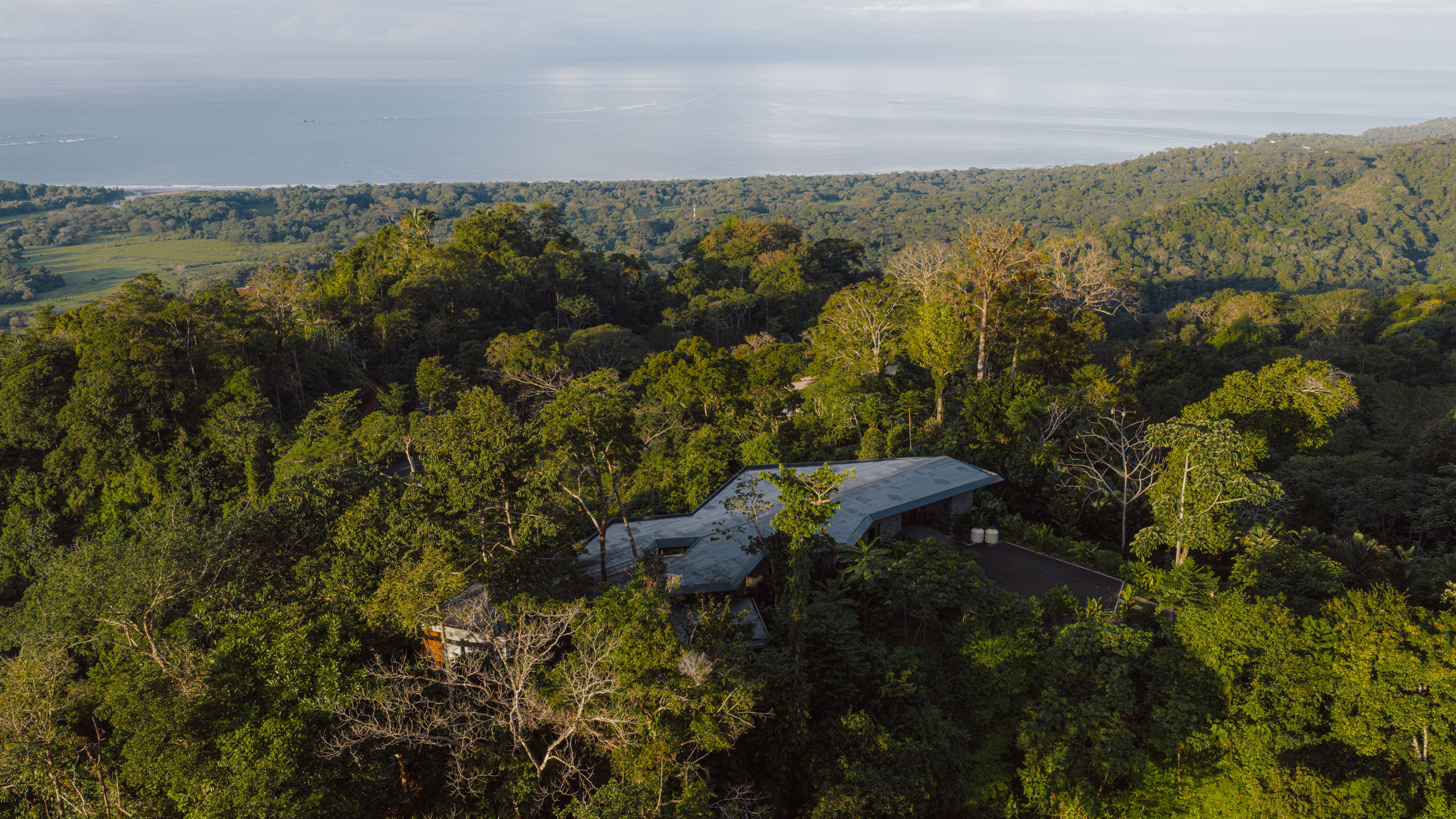 «En lo alto de la costa del Pacífico de Costa Rica, una serie de pabellones se despliega alrededor de un jardín y se conecta bajo un único techo flotante. La naturaleza se convierte en el camino, guiando el recorrido entre vistas al océano, el bosque y el cielo.«