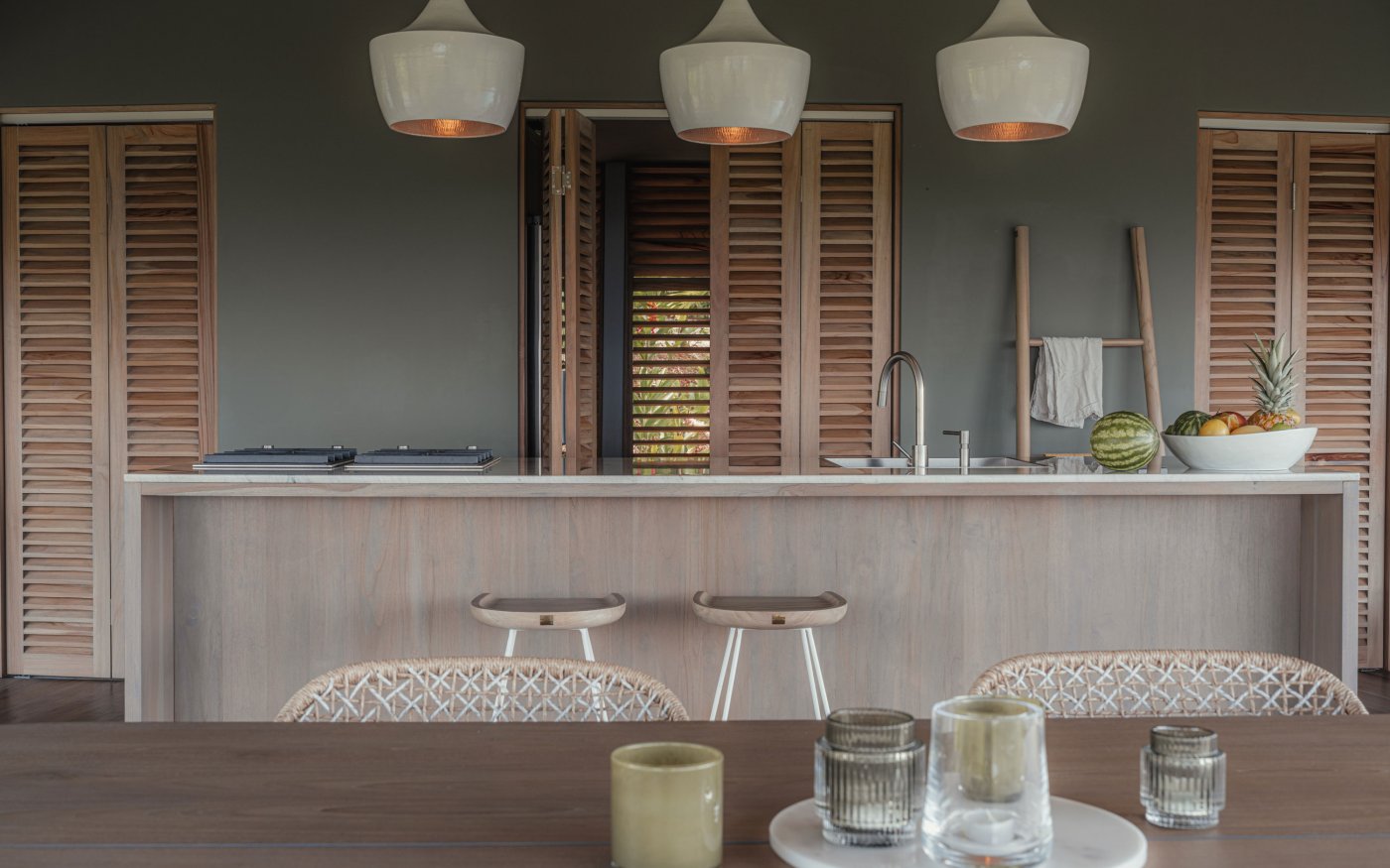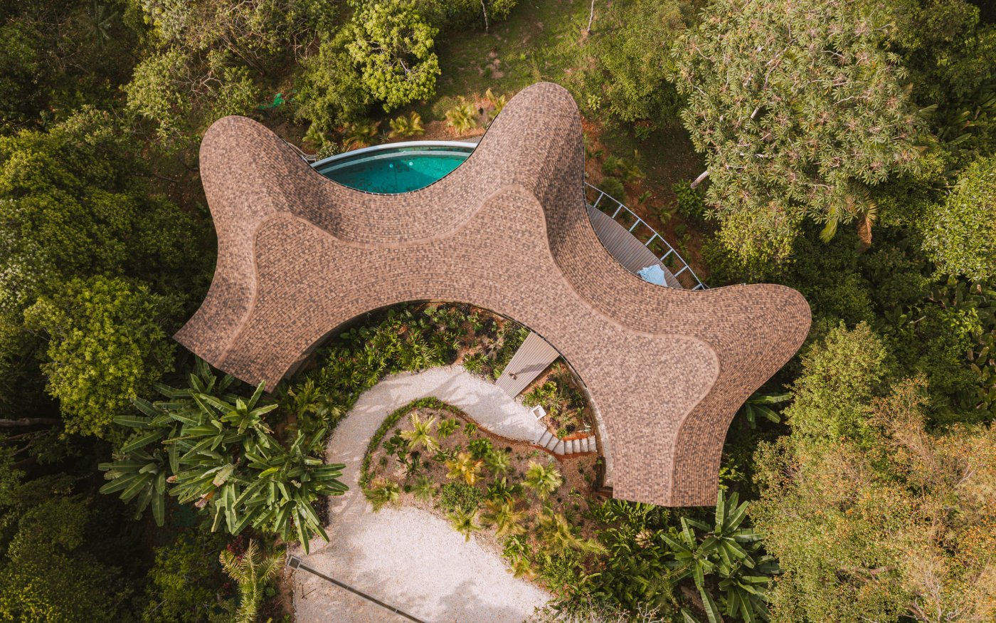 Benjamin Saxe desarrolló el concepto a partir del deseo de fortalecer el vínculo entre la arquitectura y la naturaleza. Al introducir una forma suave y sinuosa dentro de un entorno natural potente, el diseño estableció un lenguaje que dialoga con las geometrías del paisaje. La línea del techo se convierte en un gesto fluido que permite a los habitantes sentirse plenamente conectados con el exterior, mientras enmarca vistas continuas hacia el océano. La arquitectura acompaña un estilo de vida donde las personas se reconectan con su entorno, consigo mismas y entre ellas a través del acto de vivir al aire libre.