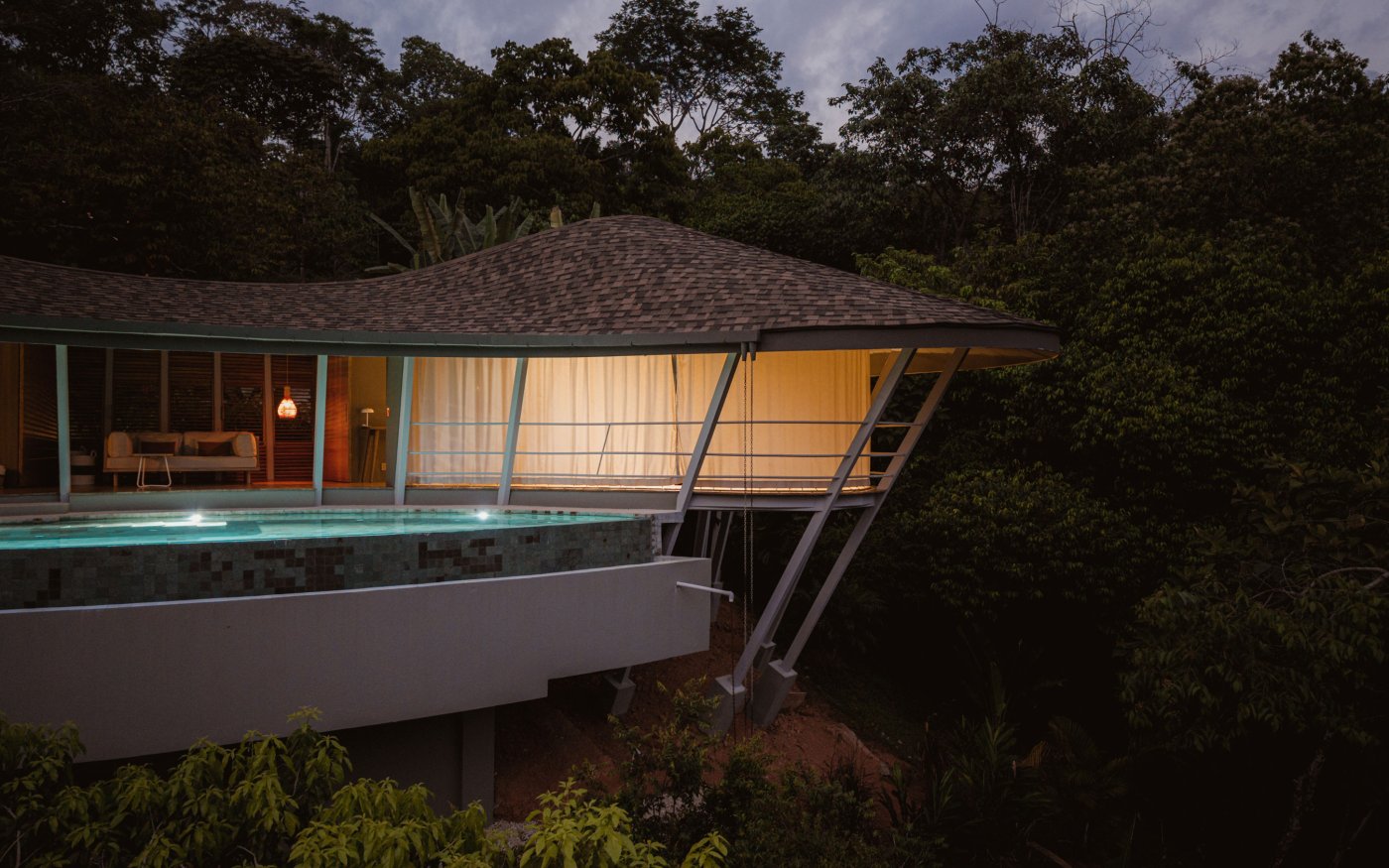 Desde el inicio imaginamos formas orgánicas y líneas curvas que se sintieran naturales para este sitio en Bahía Ballena. La primera propuesta ya incorporaba este techo ondulante y conectamos de inmediato con la idea. Elevar la casa tenía mucho sentido porque favorece la ventilación y nos sitúa entre los árboles. Nos da la sensación de flotar, manteniéndonos conectados con el terreno. Cada volumen tiene su propia atmósfera, desde las vistas verdes y tranquilas del dormitorio hasta el amplio horizonte oceánico del área de piscina. Los rituales cotidianos se han integrado a la arquitectura, ya sea preparar café observando el mar o abrir las cortinas por la mañana mientras el bosque despierta. La piscina y la vista más allá forman una figura que nos recordó un ojo, lo que inspiró el nombre Ojo de Nila. Vivir aquí se siente tranquilo y natural, exactamente como lo imaginamos al concebir esta casa por primera vez”.